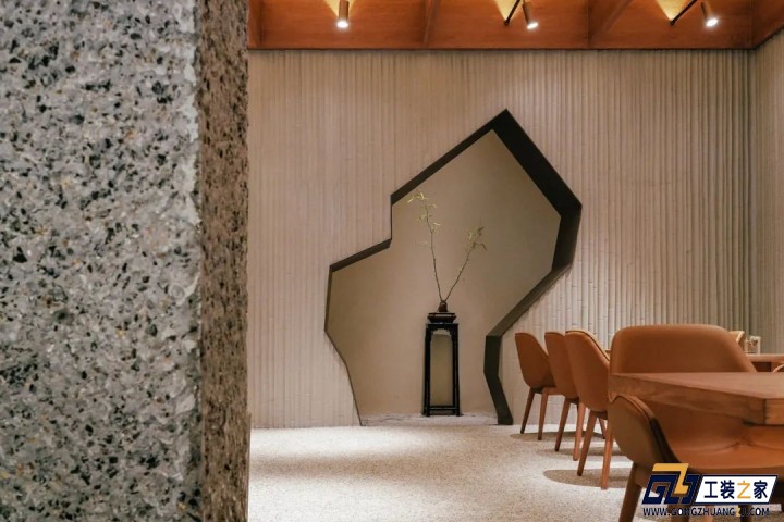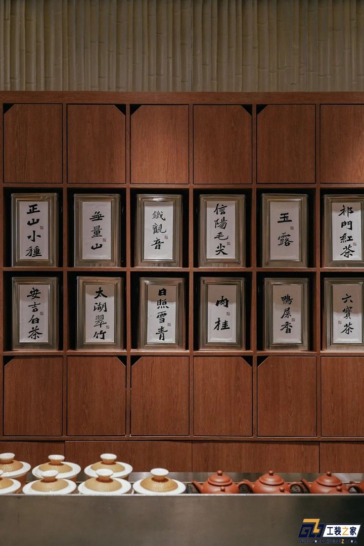 設計理念:【空間名稱】:山茶 【空間地址】:中國·河南 鄭州 【空間面積】:120㎡ 【設計公司】:徽宗設計研究室 【空間主材】:金屬瓦楞板、柚木、水刷石、硅藻泥涂料、青磚、竹模板混凝土、銅色金屬、木地板、黑色金屬漆 設計師用了竹子的設計元素組成室內的景觀,讓這一間小室成為繁華街道中難得的幽靜處所。茶道和幾何形狀的門洞,展現出一種簡潔的線條美感。可能是用來回憶自己仿若多年前的夏天,在郁郁蔥蔥的桃源路梧桐街道,大片大片的綠色。