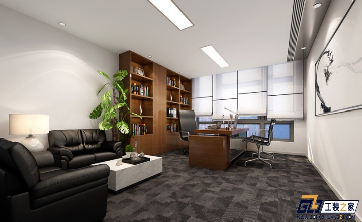 設計理念:本方案整體空間地面采用了灰藍色的塊毯,實木辦公家具,頂面石膏板吊頂,墻面刷白色乳膠漆。整體上的搭配很符合企業的氣質